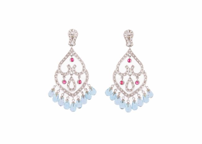 Oro bianco kt.18 Acque marine kt.18, rubini kt.0,60 e brillanti kt.2,00 – cm.6 lunghezza Anno di creazione: 1925 ca.