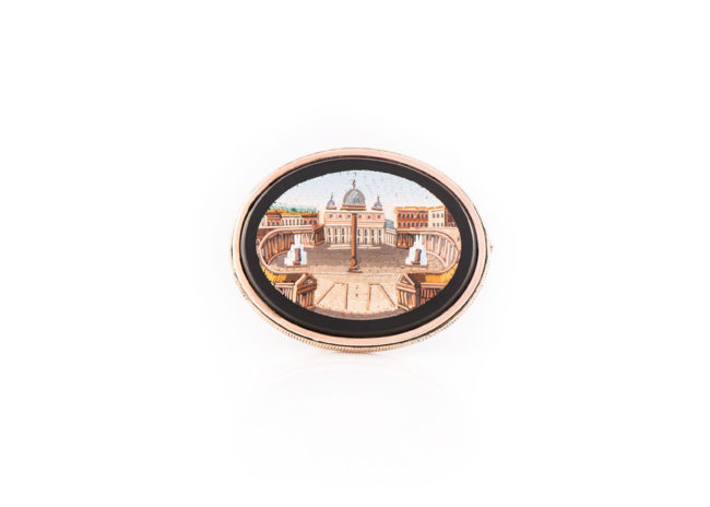 Spilla mosaico (San Pietro) gr.20,40 Onice e oro kt.18, diametro cm.4,5 Anno di creazione: 1875ca.