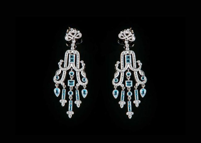 Platino con diamanti e acque marine – cm.6,5 Anno di creazione: 1950 ca.