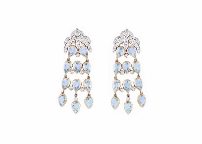 Oro bianco kt.18 Acque marine kt.18, rubini kt.0,60 e brillanti kt.2,00 – cm.6 lunghezza Anno di creazione: 1925 ca.
